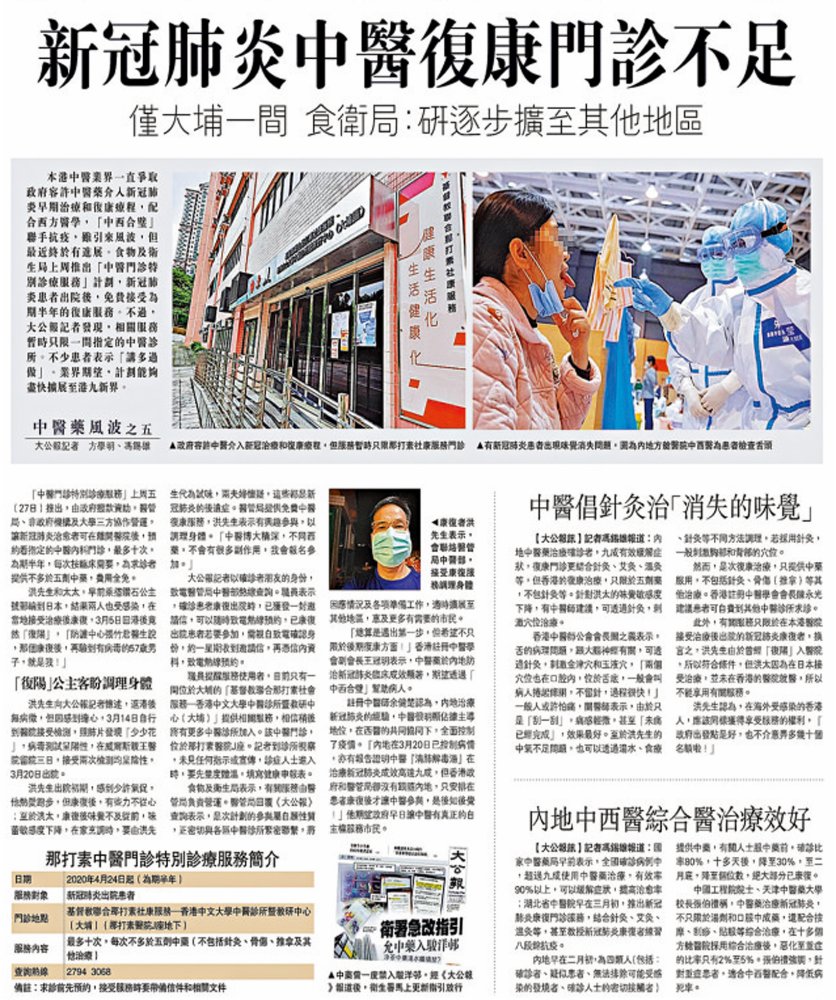 醫院管理局於2020年4月推出「中醫門診特別診療服務」計劃,新冠肺炎患者出院後,免費接受為期半年的復康服務,根據中醫師的臨床診斷接受最多10次治療。《大公報》率先多次報道倡議讓中醫參與復康治療新冠肺炎,政府接納意見,相關診所數目由最初「零間」,增至現時18間。
