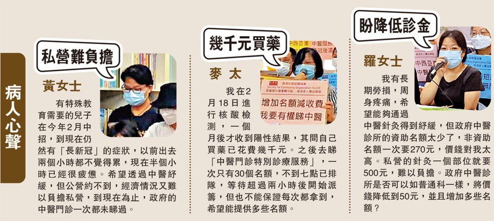 社協表示,康復者對中醫需求大,但服務推出時間較後,或因宣傳及預約困難等問題,導致基層市民使用率偏低。社協希望政府能增加受惠名額,發展公營中醫服務,設立「新冠後遺症醫療券」,紓緩市民的經濟壓力。社協還建議,將每次120元的診費調至50元,與普通科門診一致。