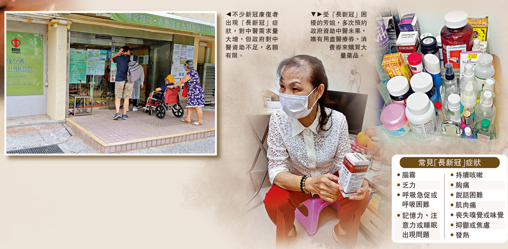 (大公報 記者 邵穎)本港估計有90萬名新冠肺炎康復者出現「長新冠」症狀,中醫對新冠的療效獲得肯定,令需求大增,但政府現時對醫院管理局三方協作的中醫門診資助明顯不足。有蝸居劏房的新冠康復者負擔不起看私營中醫,又預約不到資助中醫門診,只好用盡醫療券、消費券,購買各類藥物自救,包括850元一顆的牛黃丸等,卻未能有效調理,迄今仍有咳嗽嘔吐。
