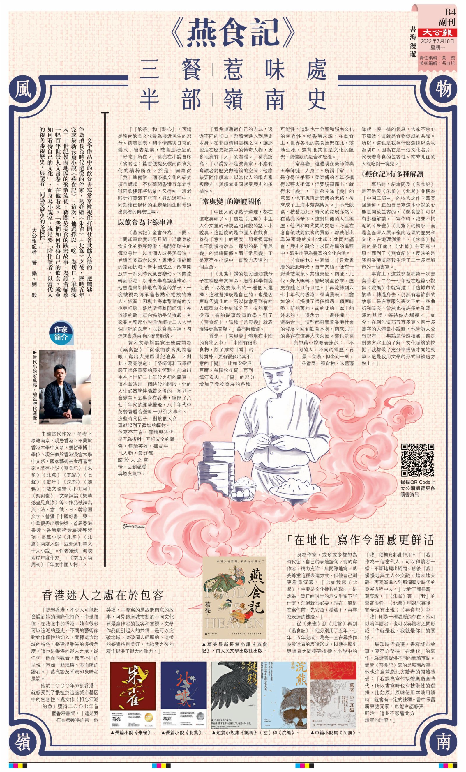 專訪時,記者問及《燕食記》是否是與《朱雀》《北鳶》並稱為「中國三部曲」的收官之作?葛亮回應道,正如自己寫這本小說的心態是開放包容的,《燕食記》可以有多種解讀,「寫作時,我並不拘泥於《朱雀》《北鳶》的輪廓,而是全面深入展示嶺南地區的歷史和文化。在地理側重上,《朱雀》描寫的是江南,《北鳶》主要寫中原,而到了《燕食記》,反映的是我對香港這座我生活了二十多年城市的一種書寫。」