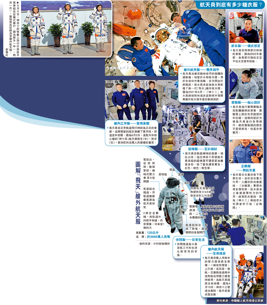 (大公報 記者 劉凝哲)神舟十四號航天員乘組在軌工作已逾40天,他們即將在空間站首次迎來問天實驗艙的到訪,並首次通過問天艙氣閘艙進行太空出艙活動,航天員穿飛天戰袍出艙作業的畫面讓各方翹首以盼。通過官方公布的視頻,網友們注意到了航天員的「太空衣櫃」。有細心的網友發現,這次航天員的衣服更加多樣,彩色的運動衫也十分搶鏡,着「企鵝服」對抗失重也讓人大開眼界。航天員到底有多少衣服?就讓我們一起看看航天員的「變裝秀」。