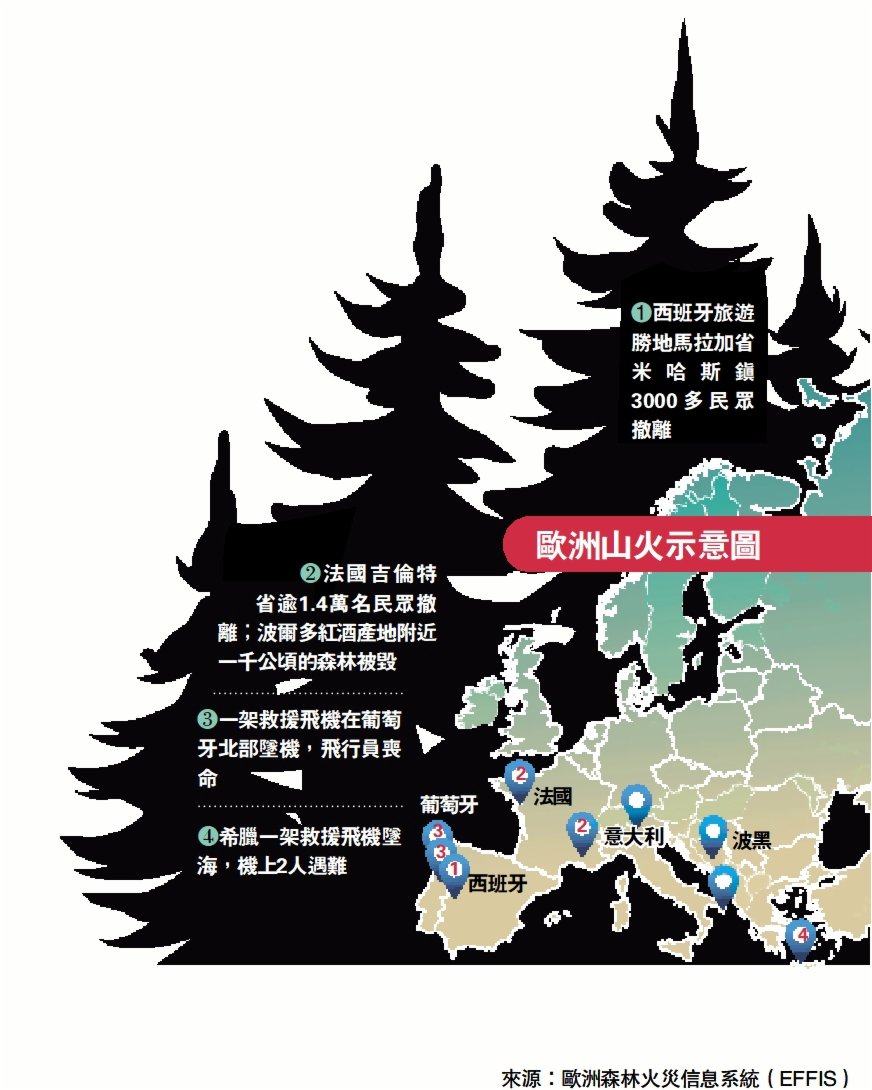 大公報綜合BBC、《華盛頓郵報》報道:在持續熱浪侵襲下,歐洲及北非地區的山火持續,葡萄牙和摩洛哥上周燃起的大火尚未撲滅,法國、西班牙及希臘等地17日又有新的起火點出現。法國1.4萬民眾緊急疏散;葡萄牙邊境有一架救援飛機墜落,飛行員喪生;西班牙的火勢貫穿南北;摩洛哥有一人死於火災,多國損失慘重。