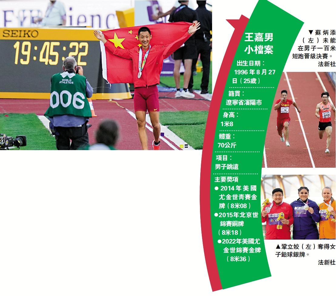 據大公報援引新華社報道:王嘉男創造了歷史!16日在美國俄勒岡州尤金市進行的2022俄勒岡世界田徑錦標賽中,王嘉男最後一輪跳出8米36,奪得男子跳遠冠軍,這是中國選手在該項目中首次獲得世錦賽冠軍。女子鉛球決賽中,東京奧運會冠軍鞏立姣擲出20米39收穫銀牌。亞洲「飛人」蘇炳添止步於男子100米準決賽。