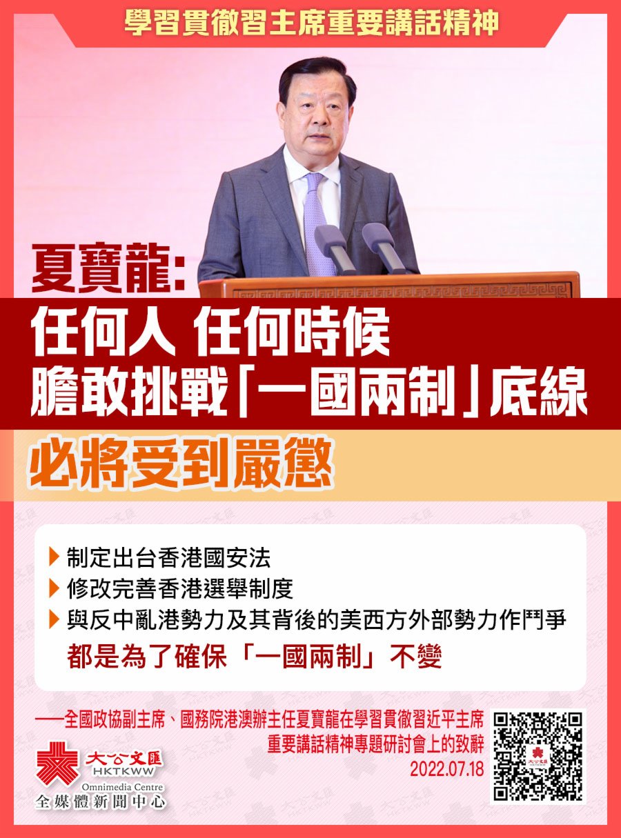夏寶龍強調,任何人,任何時候,膽敢挑戰「一國兩制」底線,膽敢反中亂港、反中亂澳,必將受到嚴懲!