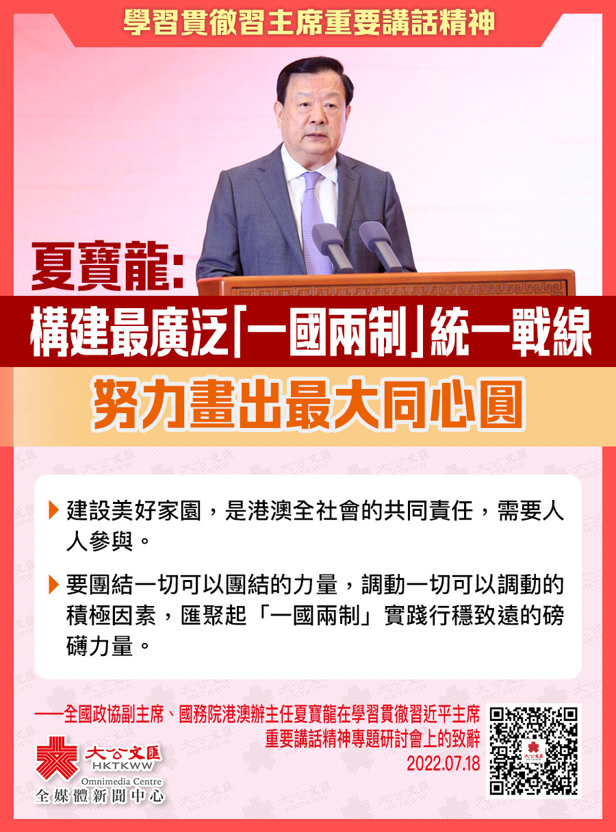 夏寶龍表示,習近平主席希望每一位香港居民都成為建設香港的積極力量,共同把香港這個家園建設好、守護好。「家和萬事興」。建設美好家園,是港澳全社會的共同責任,需要人人參與。要團結一切可以團結的力量,調動一切可以調動的積極因素,構建最廣泛的「一國兩制」統一戰線,在愛國愛港、愛國愛澳旗幟下努力畫出最大同心圓,匯聚起「一國兩制」實踐行穩致遠的磅礴力量。