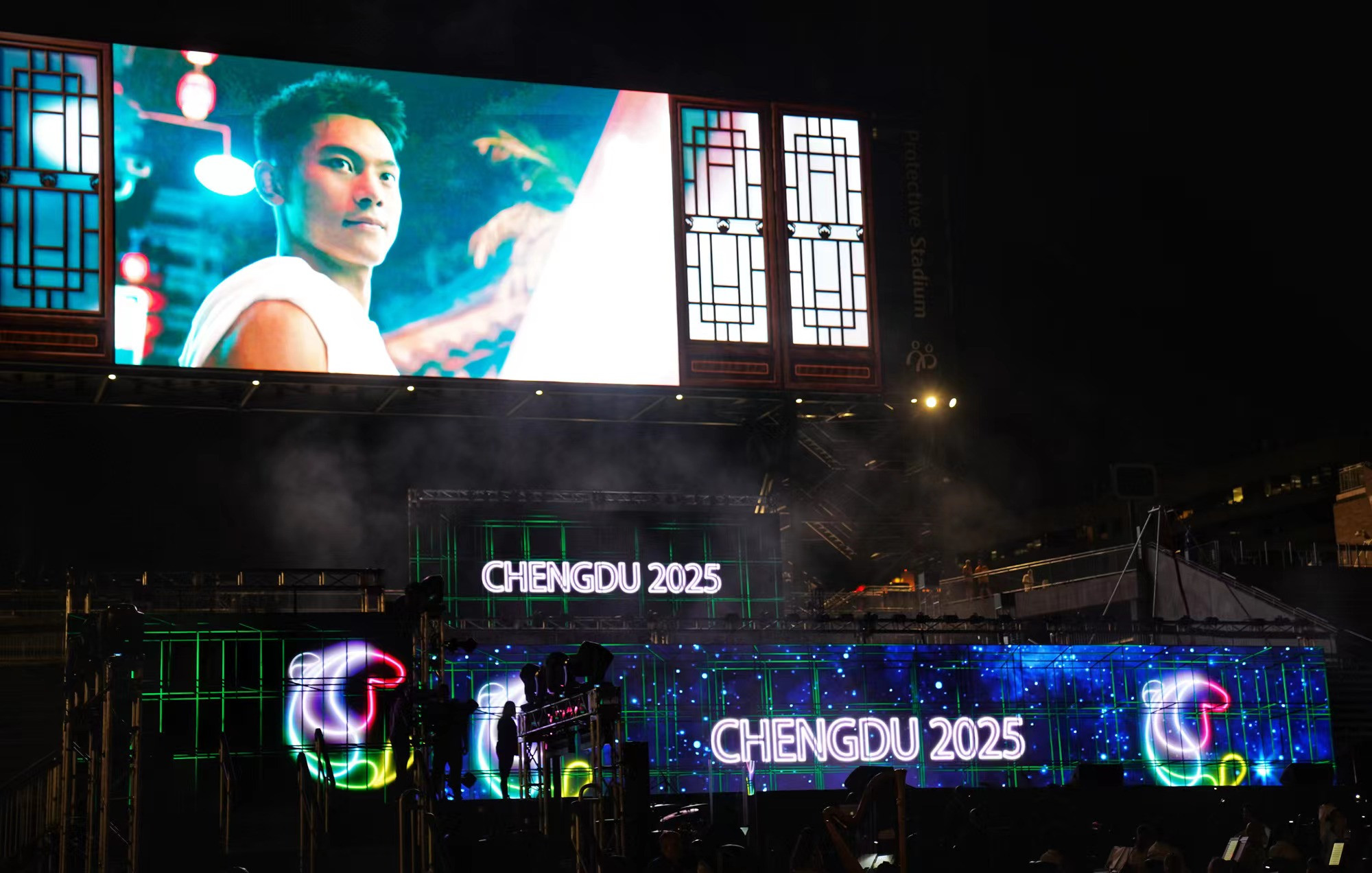 當晚,在暖場表演、入場儀式、嘉賓致辭等環節後,閉幕式迎來接旗儀式和「成都時間」文藝展示。在接旗儀式環節,國際世界運動會協會會旗從美國伯明翰交接到中國成都。隨後,成都作為下一屆世界運動會舉辦城市,呈現了精彩的「成都時間」大型展演。