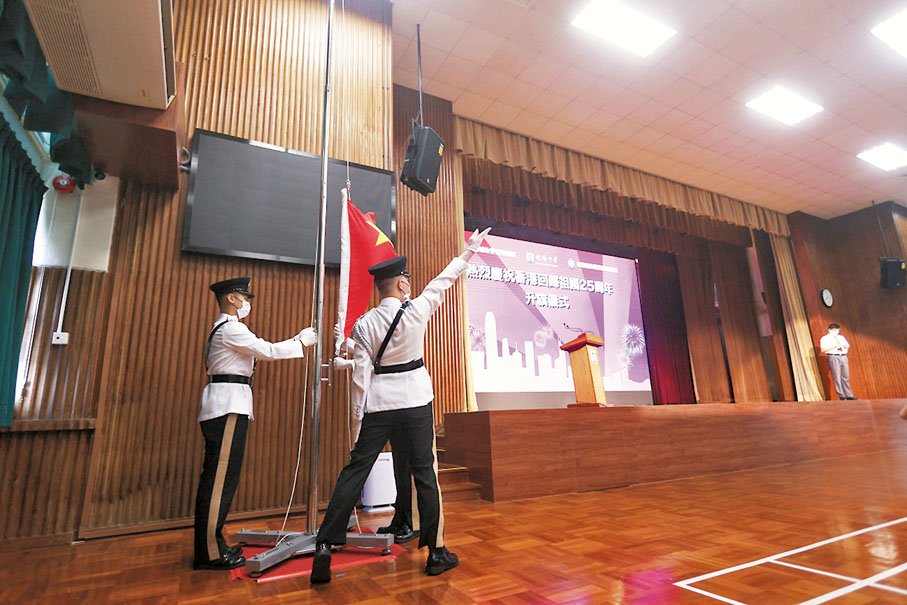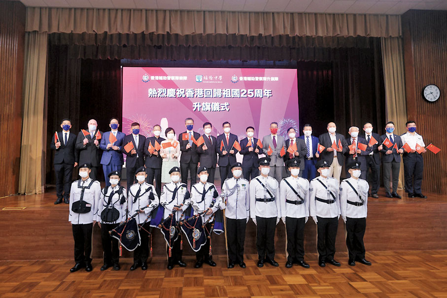(香港文匯報 記者 高鈺)盛夏驕陽似火,培僑中學昨日舉行慶祝香港回歸祖國25周年升國旗儀式。香港輔助警察隊樂隊奏起《歌唱祖國》,為典禮拉開序幕;輔警升旗隊首次進入校園升國旗,他們以整齊劃一的中式步操邁向旗杆,在莊嚴國歌聲中冉冉升起五星紅旗。保安局局長鄧炳強致辭時指出,保安局轄下六個紀律部隊和兩支輔助部隊近年致力加強青年工作,培育年輕人正向思維及守法意識,並加強國民身份認同。教育局局長蔡若蓮則強調,教育局會繼續加強推動國民教育,加深青少年對國家的認識同歸屬感,成為愛國愛港的新一代。