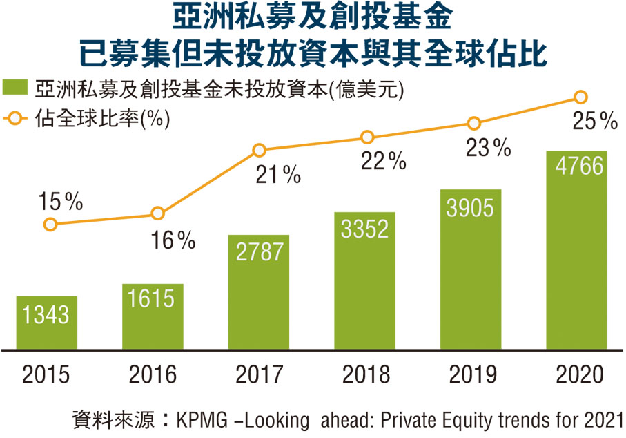 據畢馬威去年的一份行業研究報告統計,亞洲私募及創投基金已募集但未投放的資本(行業內稱為Dry Powder)創下新高,逾4,700億美元,佔全球25%並超過了歐洲的份額(19%)。而去年一隻專注於亞太區投資的私募基金完成了達150億美元的融資,創下了同類型基金的新紀錄。種種數據預示,亞洲私募及創投基金的投融資活動將會愈趨活躍。而以資產管理規模計算,香港目前已經是亞洲區內第二大私募基金市場(管理1,730億美元),僅次於內地。