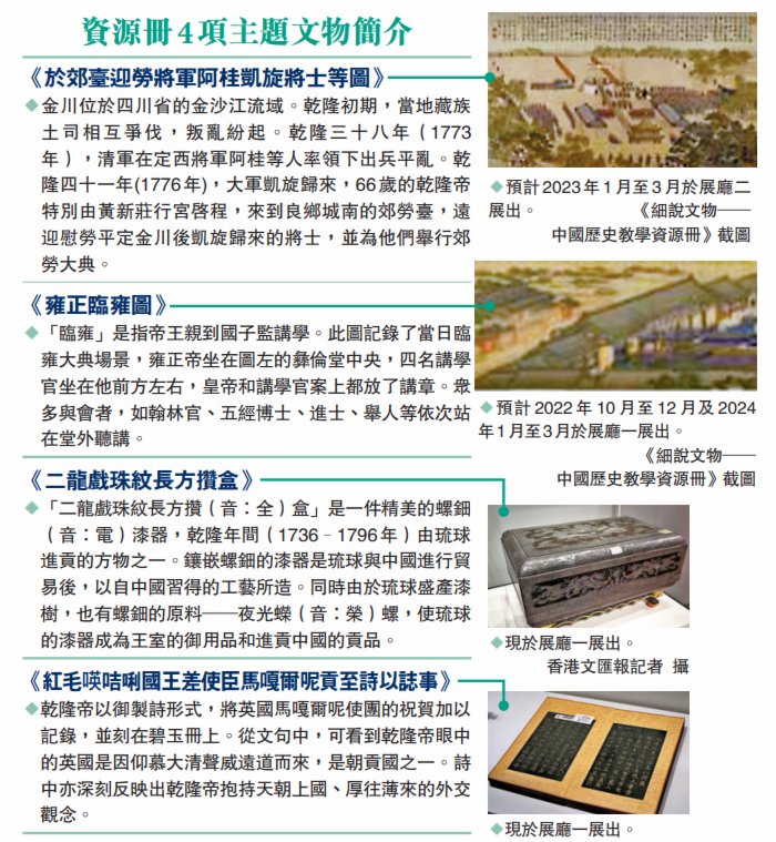 教學資源冊共有4個學習活動單元,分別對應《於郊臺迎勞將軍阿桂凱旋將士等圖》《雍正臨雍圖》《二龍戲珠紋長方攢盒》及《紅毛𠸄咭唎國王差使臣馬嘎爾呢貢至詩以誌事》4項主題文物,以此配合學校課程和學習活動。