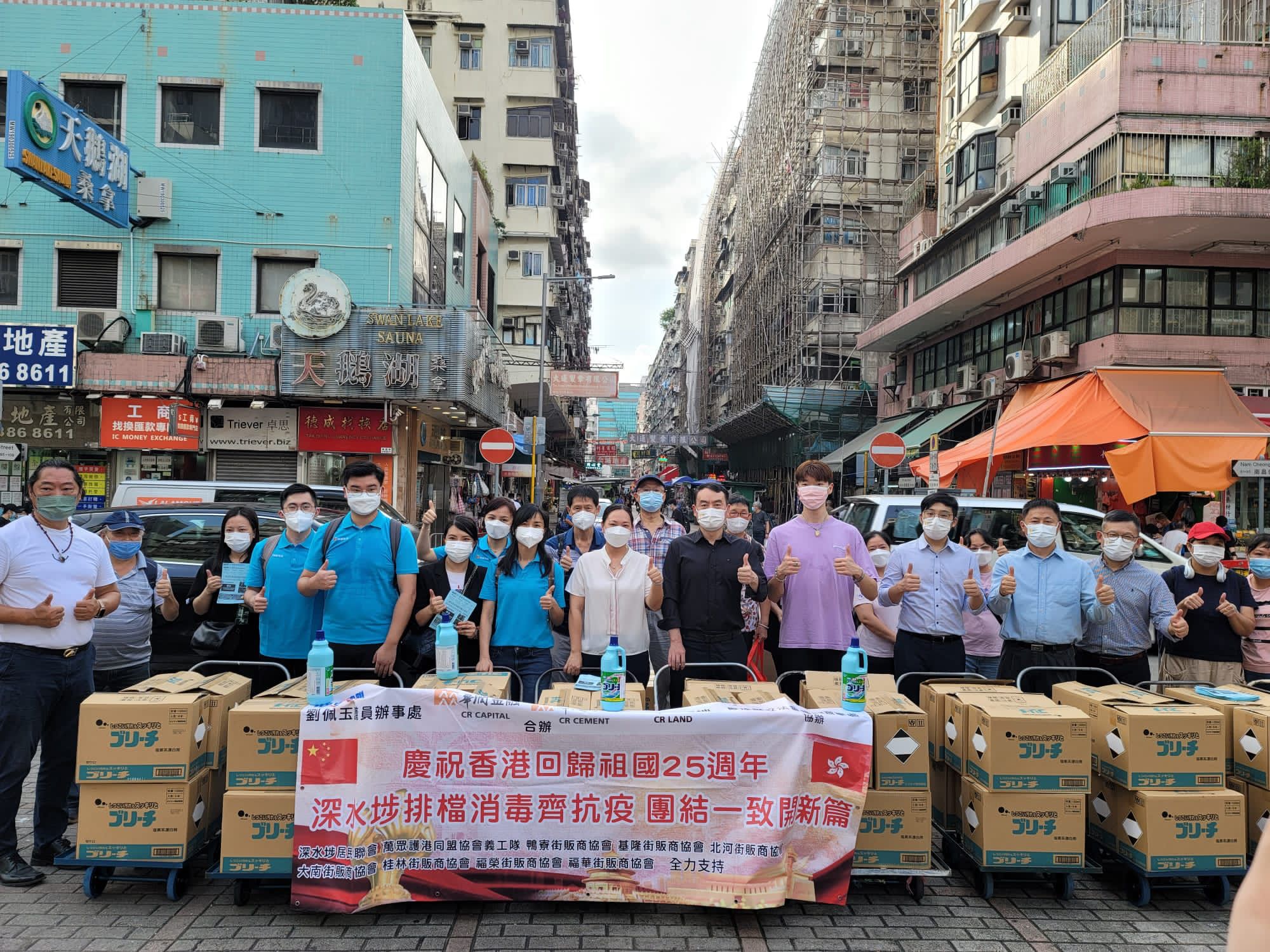 大公文匯全媒體報道,國家主席習近平在慶祝香港回歸祖國25周年大會暨香港特別行政區第六屆政府就職典禮上發表重要講話。在香港社會各界深入學習貫徹習近平主席重要講話精神之際,深水埗區議員劉佩玉昨日(18日)聯同華潤集團屬下的華潤置地、華潤水泥、華潤金融3間在港央企,舉辦「深水埗排檔消毒齊抗疫 團結一致開新篇」活動,身體力行走入深水埗社區,為基層七條排檔區,逾750個販商派送漂白水。