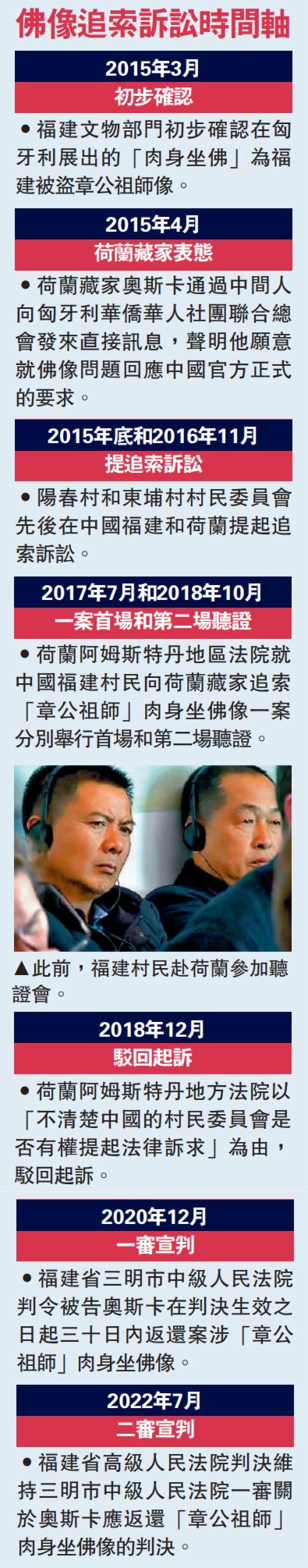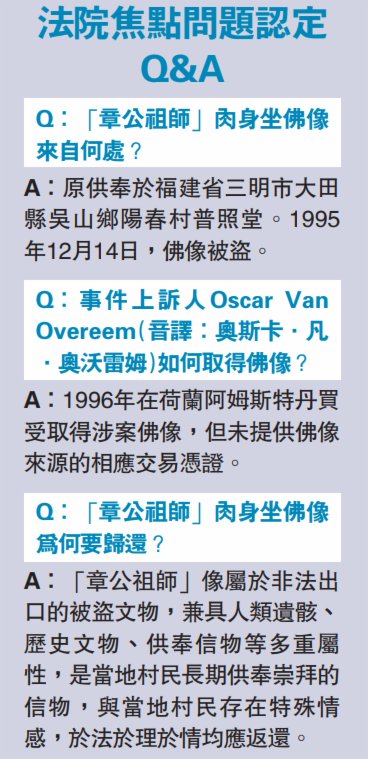 (大公報 記者 蘇榕蓉)被盜近27年,備受海內外關注的福建「章公祖師」肉身坐佛跨國追索一案有了最新進展。7月19日上午,福建省高級人民法院依法對「章公祖師」肉身坐佛二審進行公開宣判:維持三明市中級人民法院一審關於奧斯卡應返還「章公祖師」肉身佛像的判決。東埔村、陽春村兩村代理律師范丁寶表示,這是一次公開公正的判決,希望奧斯卡能切實履行中國法院的終審判決,讓「章公祖師」盡早回歸普照堂。據悉,奧斯卡主張1996年在荷蘭阿姆斯特丹買來的涉案佛像,但未提供佛像來源的相應交易憑證。