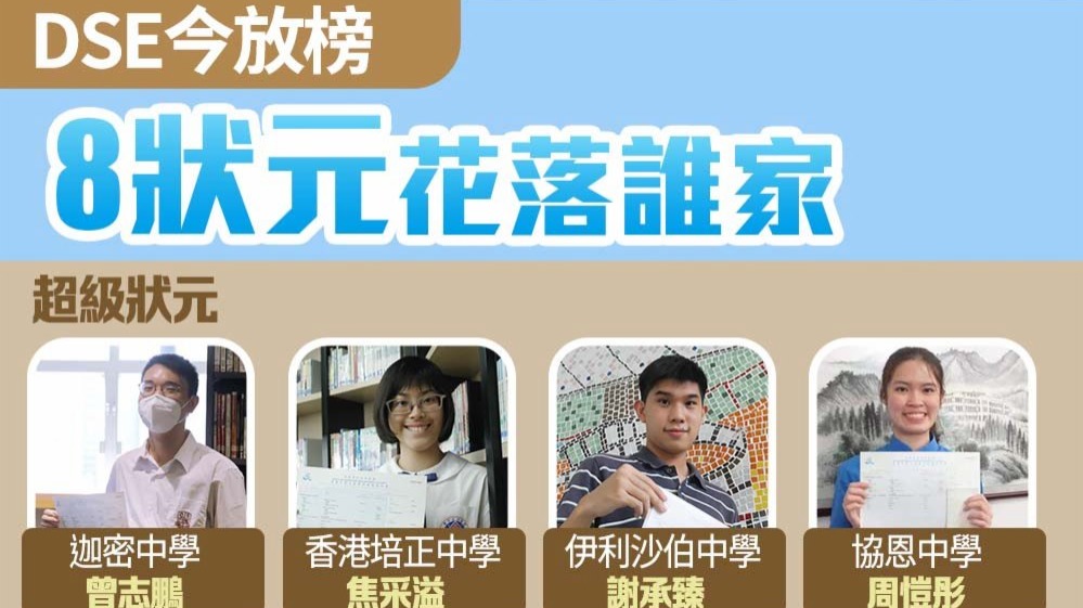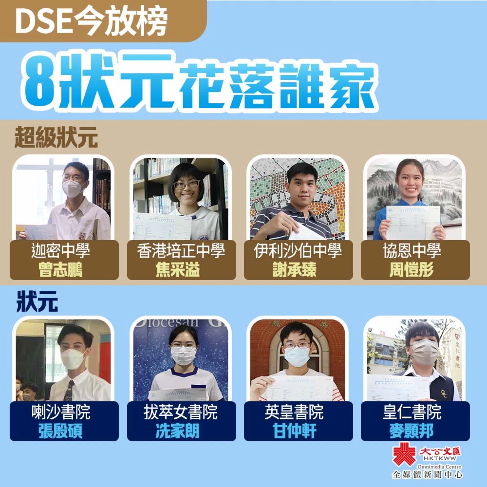 8位「狀元」分別來自拔萃女書院、英皇書院、皇仁書院、協恩中學、喇沙書院、伊利沙伯中學、迦密中學和培正中學: