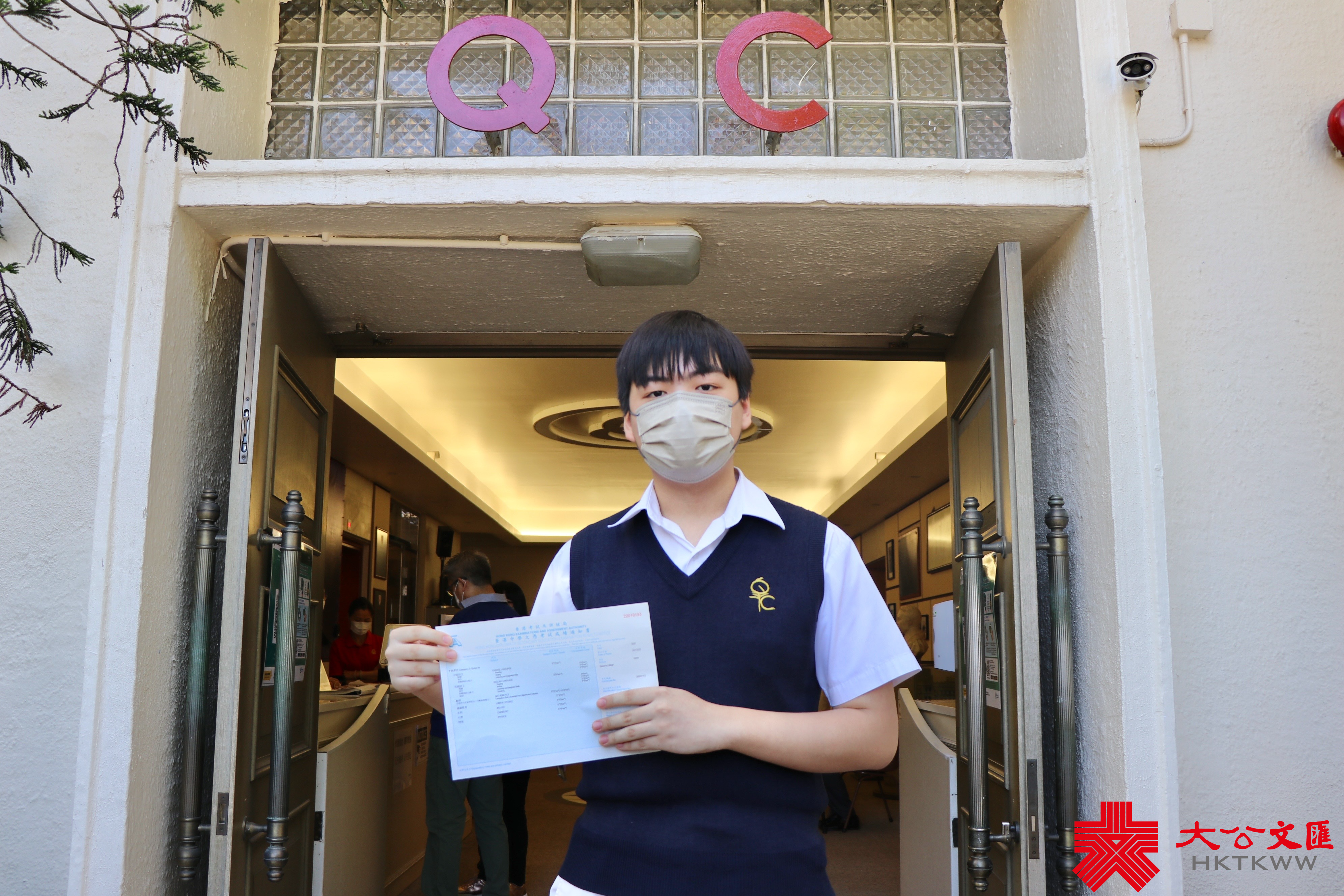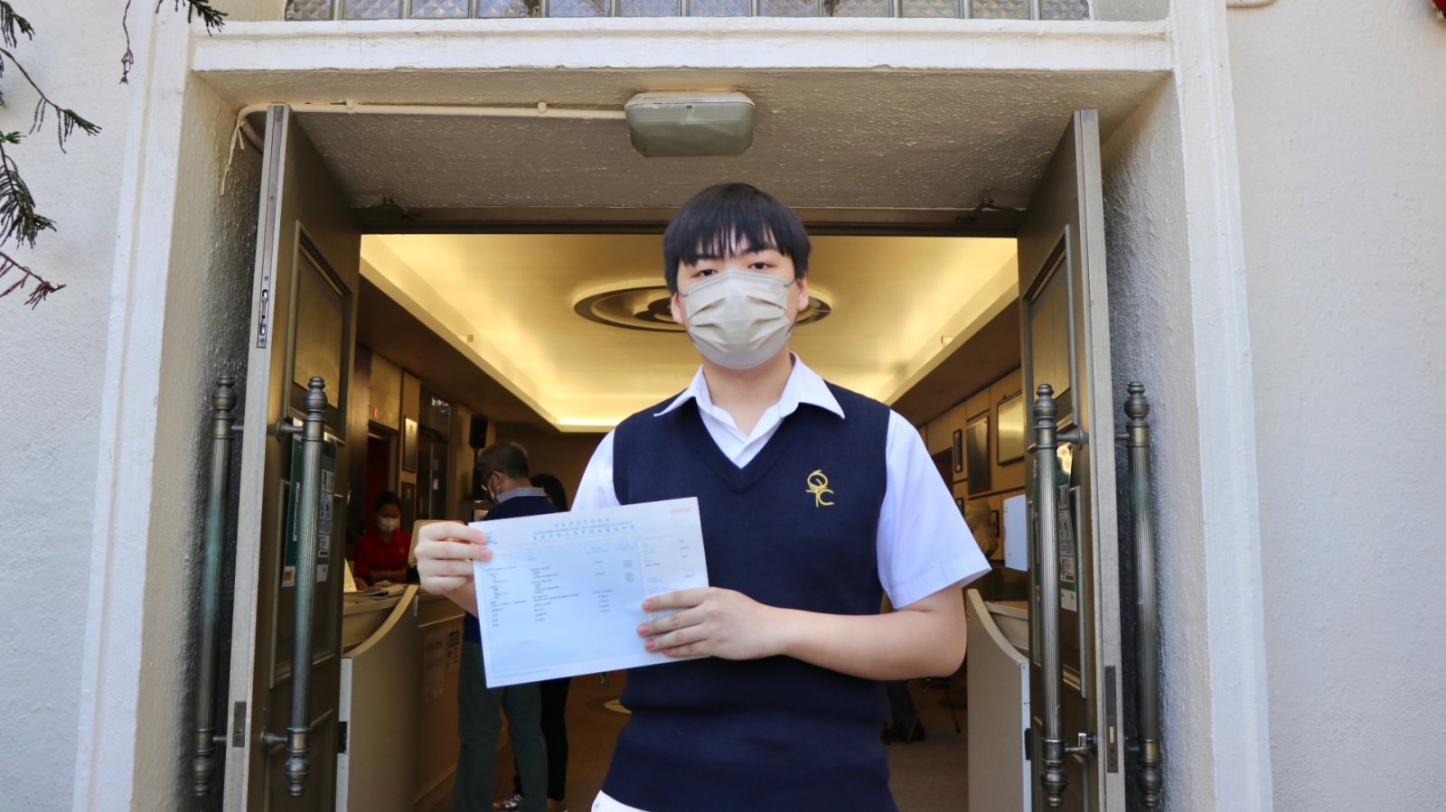 皇仁書院麥顥邦同學考獲七科5**,選修M2,成為本屆DSE考試其中一位「狀元」,皇仁另有三名「榜眼」。麥顥邦表示,自己今日有小小興奮和擔憂,擔憂是因為少有機會見到很多人。他認為今次考試沒有發揮到自己的全部水平,有些科目仍有保留。