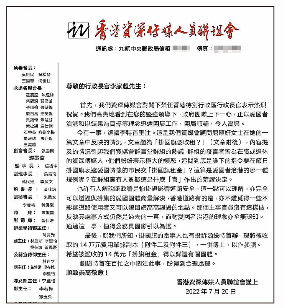 掛國旗被路政署徵檢查費令人嘩然。專欄作家屈穎妍得知事件,撰寫文章《掛國旗要收租?》批評政府有關部門收費的做法荒謬,「香港資深傳媒人員聯誼會」昨日去信(圖)行政長官李家超,促請關注。