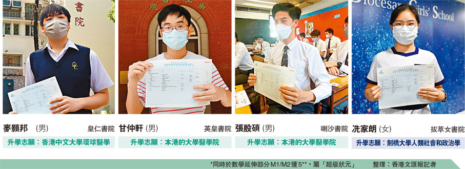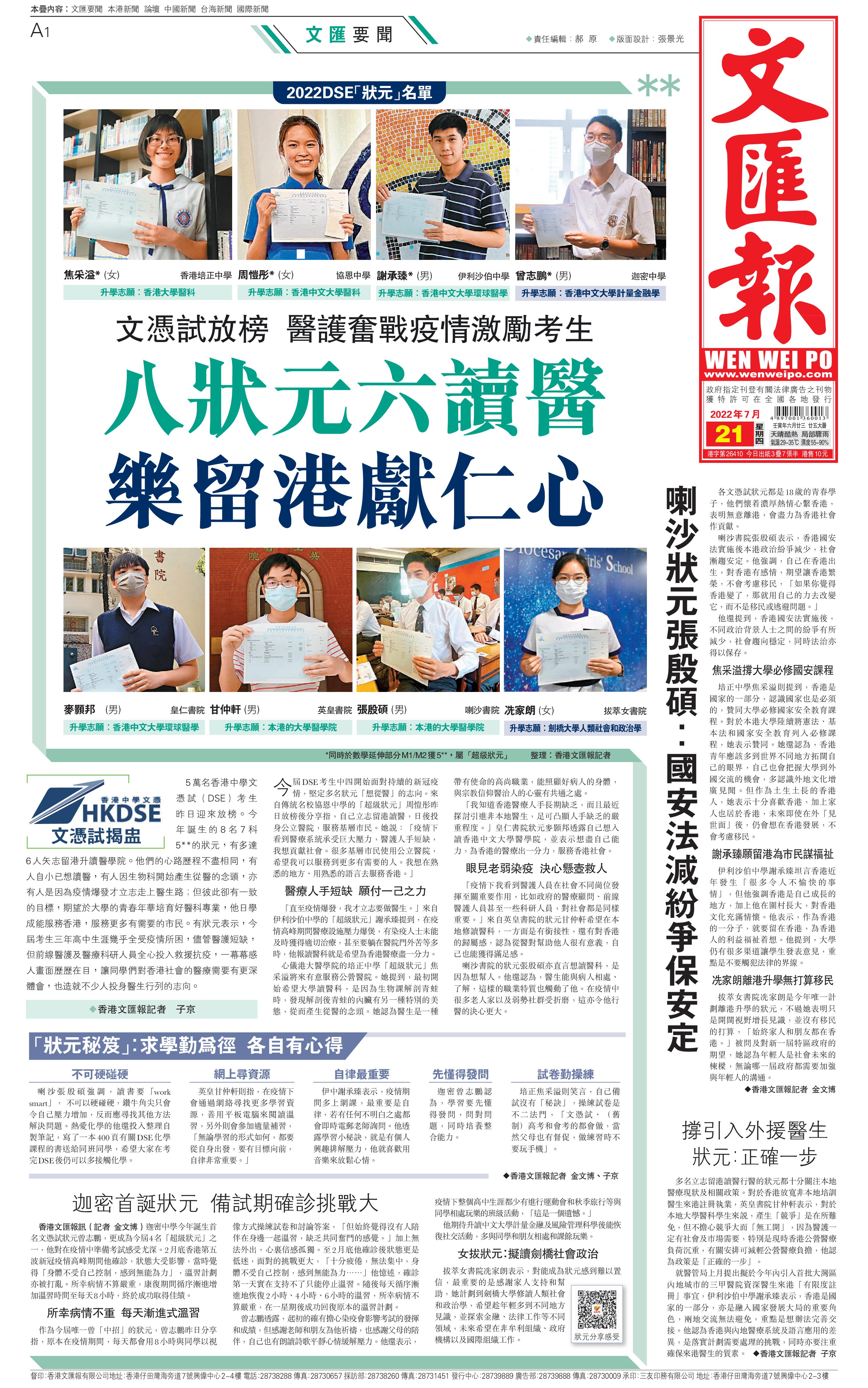 (香港文匯報 記者 子京、金文博)5萬名香港中學文憑試(DSE)考生昨日迎來放榜。今年誕生的8名7科5**的狀元,有多達6人矢志留港升讀醫學院。他們的心路歷程不盡相同,有人自小已想讀醫,有人因生物科開始產生從醫的念頭,亦有人是因為疫情爆發才立志走上醫生路;但彼此卻有一致的目標,期望於大學的青春年華培育好醫科專業,他日學成能服務香港,服務更多有需要的市民。有狀元表示,今屆考生三年高中生涯幾乎全受疫情所困,儘管醫護短缺,但前線醫護及醫療科研人員全心投入救援抗疫,一幕幕感人畫面歷歷在目,讓同學們對香港社會的醫療需要有更深體會,也造就不少人投身醫生行列的志向。