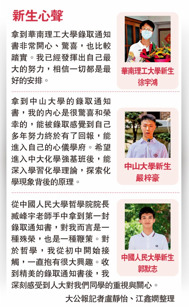 暨南大學的錄取通知書裏面有一艘「小紅船」。錄取通知書封面的彩虹門則象徵着新旅程的開啟。華南理工大學是今年廣東首個寄出本科錄取通知書的高校。「拿到通知書非常驚喜,也比較踏實。」畢業於廣州市第二中學的徐宇鴻同學是第一位收到錄取通知書的新生。記者看到,華工充滿設計感的新款通知書以紅色為主色調,通知書內頁左側,是結合校園風景製作的四聯小型郵票。除錄取通知外,華工還為新生準備了「入學大禮包」,其中附帶有新生入學須知、學生卡、資助手冊等。