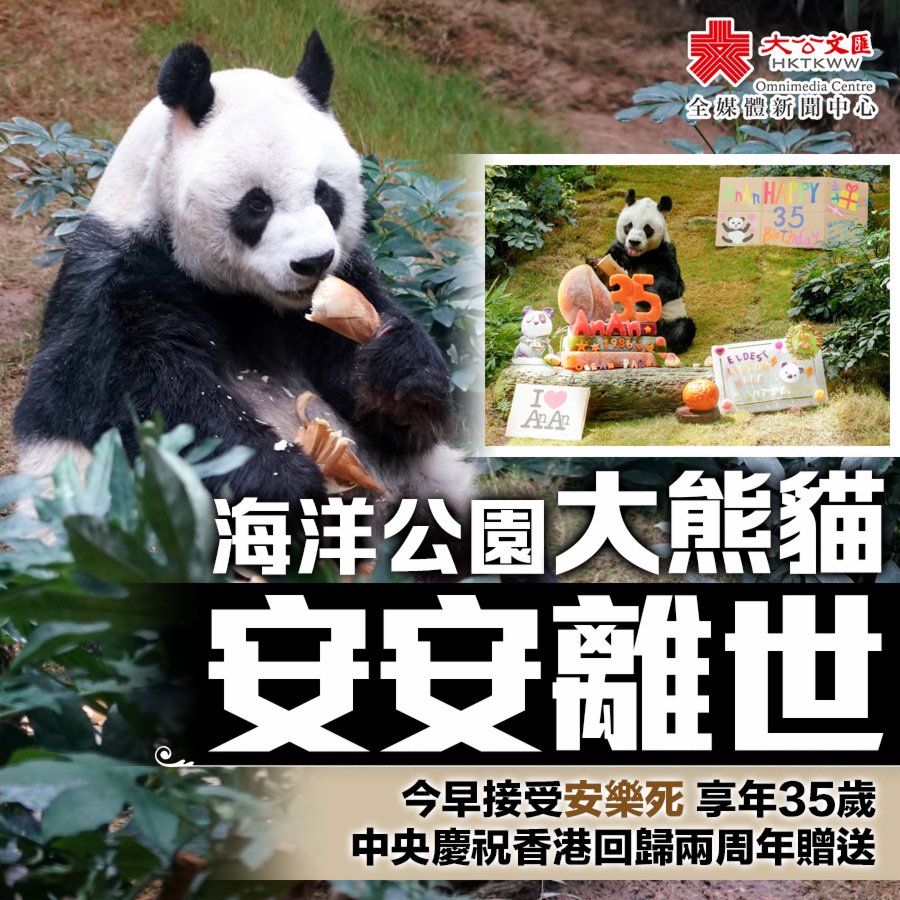 大公文匯全媒體報道,海洋公園大熊貓安安今日(21日)早晨離世。根據海洋公園今日在社交平台上表示,安安享年35歲,等同於人類105歲高齡,是全球人類照顧下最長壽的雄性大熊貓。安安的健康狀況在過去數星期慢慢轉差,進食及活動量均大幅下降,身體變得非常虛弱,在人道而言,它的生命已走到盡頭。海洋公園同漁護署的獸醫在徵詢中國大熊貓保護研究中心後,基於動物福祉理由,忍痛以安樂死讓安安免於痛苦,並於今日上午8時40分在「香港賽馬會四川奇珍館」內為安安進行有關程序。