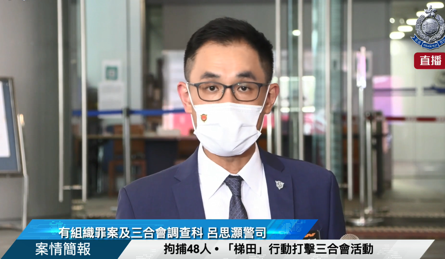 大公文匯全媒體報道,警方今日 (21日) 展開代號「梯田」的拘捕行動以打擊三合會活動及其犯罪得益,共拘捕48人,檢獲或查獲1300萬港幣犯罪得益資產。