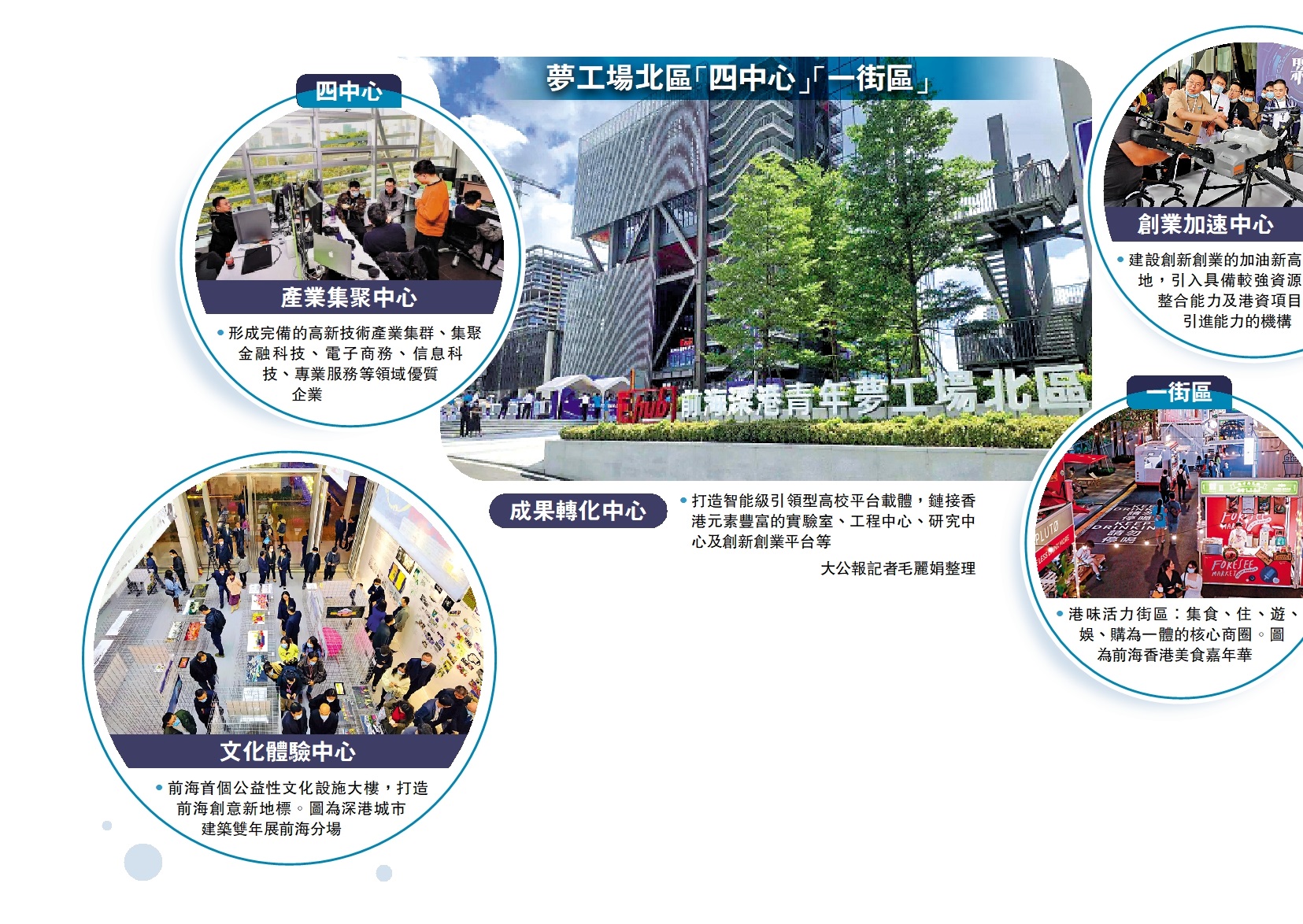 功能布局方面,夢工場北區擬實現港人港企規模化集聚發展,引入企業類、機構類及平台類優質項目,結合體系化的運營配套,重點打造4中心1街區,分別為:產業集聚中心、創業加速中心、成果轉化中心、文化體驗中心、港味活力街區。