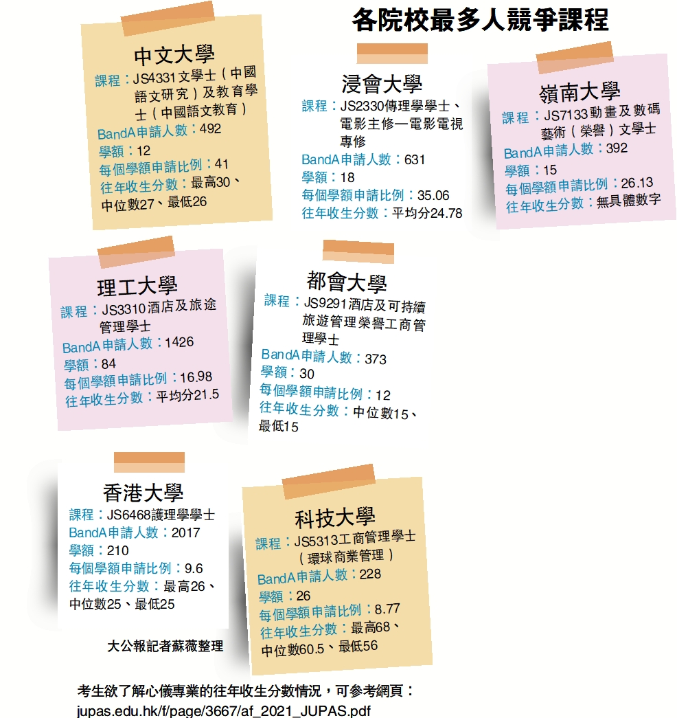 吳寶城說:「不同大學的最低收生分數不同,有6所大學的最低收生要求其實是332233的,亦有是33222的學校;同時同學要注意科目的更高要求,如法律科對英文科的要求會更高。」