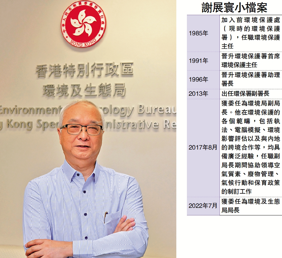 政府去年推出的《香港氣候行動藍圖2050》訂立2050年前可再生能源佔電力生產15%。謝展寰說,2035年或之前,可再生能源發電將佔電力需求約7.5%,「先計本地,再加入新技術去提升至15%,從多方面入手,包括與灣區合作做海上風力發電場,要時間探討方案。」在應對氣候變化方面,局方配合國家減碳策略,一直與內地有合作,通過「粵港環保及應對氣候變化合作小組」,重點改善灣區空氣污染問題。