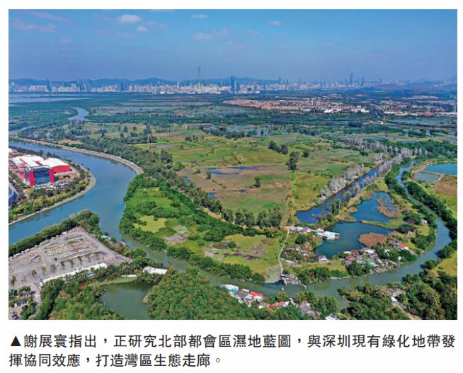 新任環境及生態局局長謝展寰接受訪問時表示,正研究北部都會區濕地藍圖,與深圳現有綠化地帶發揮協同效應,打造灣區生態走廊。有關的研究已進行,並會「提速」,研究結果有望明年年底出爐。