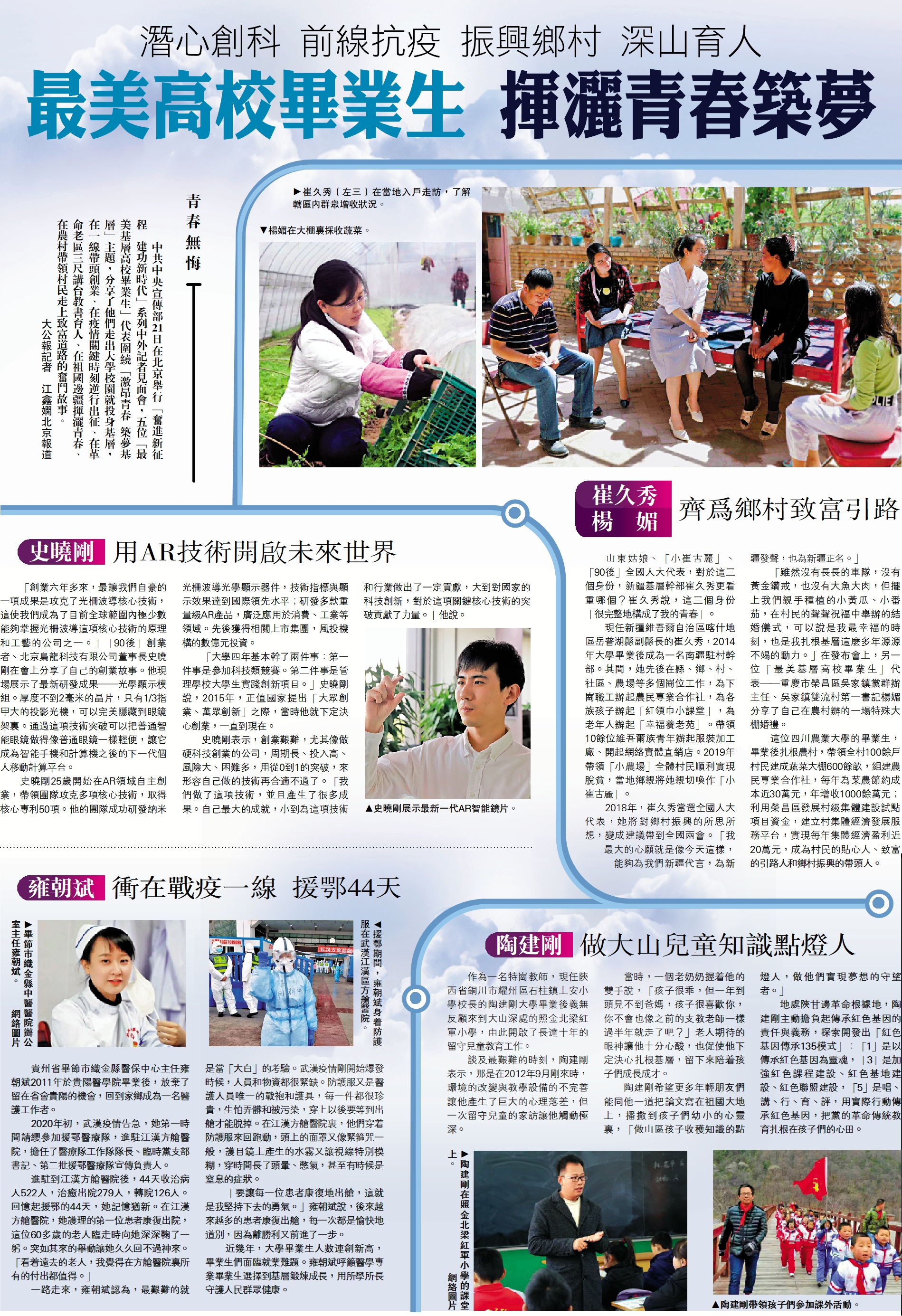 (大公報 記者 江鑫嫻)中共中央宣傳部21日在北京舉行「奮進新征程 建功新時代」系列中外記者見面會,五位「最美基層高校畢業生」代表圍繞「激昂青春 築夢基層」主題,分享了他們走出大學校園就投身基層,在一線帶頭創業、在疫情關鍵時刻逆行出征、在革命老區三尺講台教書育人、在祖國邊疆揮灑青春、在農村帶領村民走上致富道路的奮鬥故事。