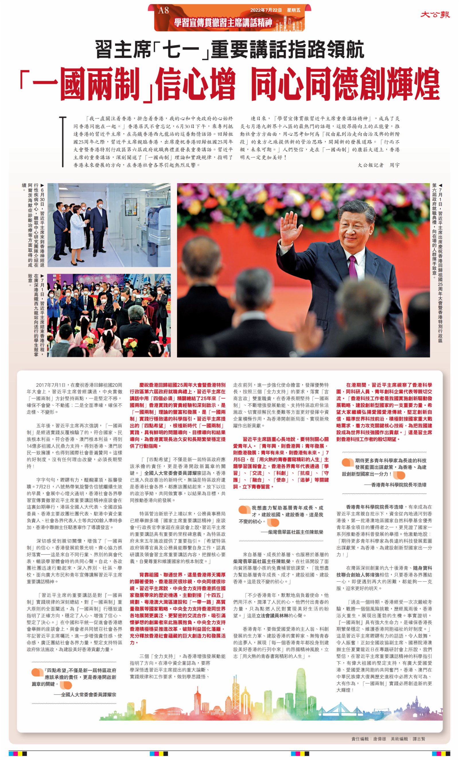 (大公報 記者 周宇)「我一直關注着香港,掛念着香港,我的心和中央政府的心始終同香港同胞在一起。」香港居民不會忘記,6月30日下午,乘專列抵達香港的習近平主席,在高鐵香港西九龍站的這番動情話語。回歸祖國25周年之際,習近平主席親臨香港,出席慶祝香港回歸祖國25周年大會暨香港特別行政區第六屆政府就職典禮並發表重要講話。習近平主席的重要講話,深刻闡述了「一國兩制」理論和實踐規律,指明了香港未來發展的方向,在香港社會各界引起熱烈反響。