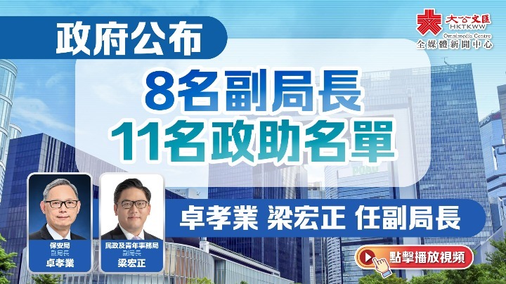 大公文匯全媒體報道,行政長官辦公室今日(22日)公布,行政長官李家超委任第六屆香港特別行政區政府8名副局長和11名政治助理。