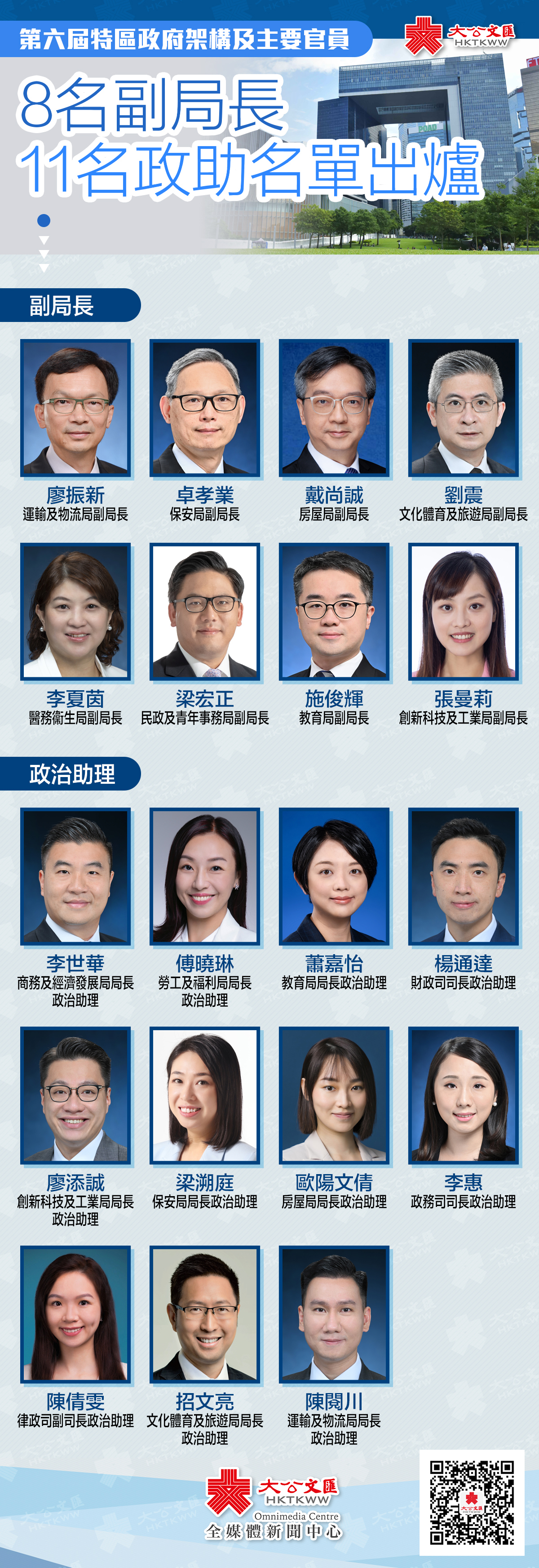 大公文匯全媒體報道,行政長官辦公室今日(22日)公布,行政長官李家超委任第六屆香港特別行政區政府8名副局長和11名政治助理。
