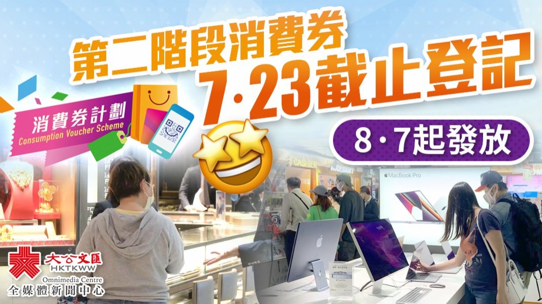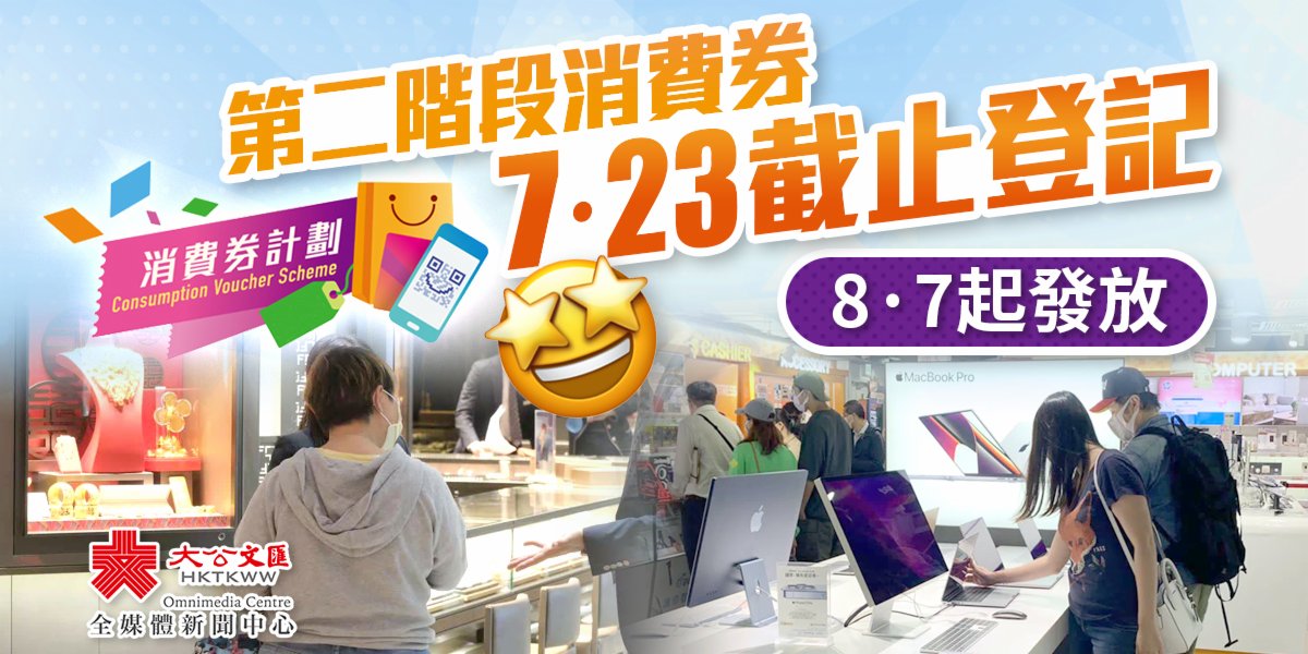 第二階段消費券計劃今日(23日)截止登記,政府發言人提醒符合資格而又從未登記的市民,以及有意更改儲值支付工具賬戶以收取第二階段消費券的現有登記人,透過計劃網站內的電子登記平台或前往任何一間臨時服務中心辦理手續。合資格登記人會在8月7日開始分期獲發放電子消費券。