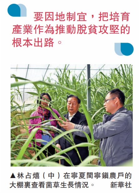 2000年7月5日,時任福建省省長的習近平出席在省政府舉辦的、專門為林占熺授獎的頒獎會。他指出,菌草技術的優勢在全國相當突出,要繼續讓它在扶貧致富方面發揮重要作用。至2021年底,寧夏全區食用菌總產值1.93億元,菇農戶均每年增收2萬多元。菌草成為當地百姓脫貧的重要產業之一。