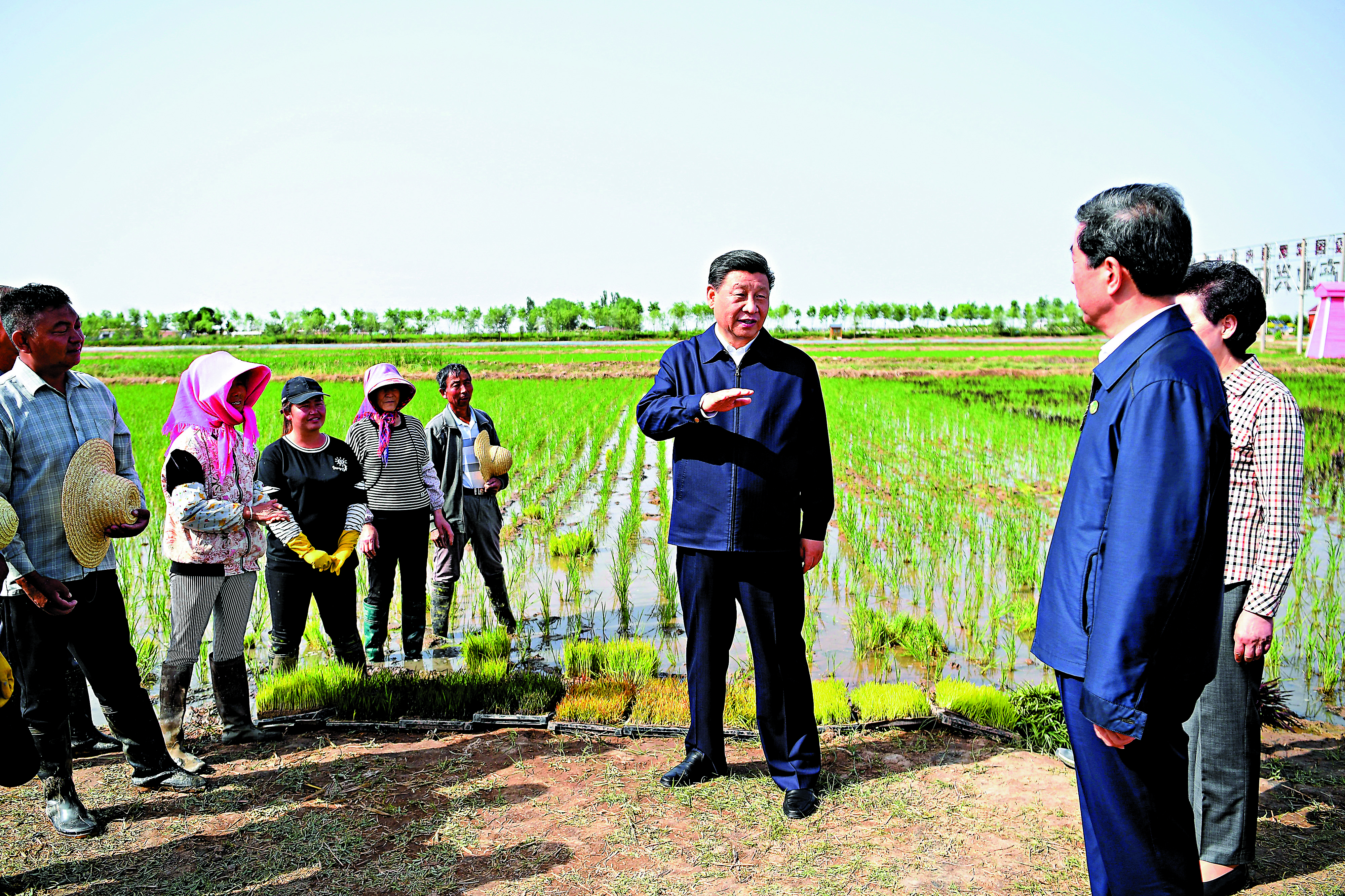 頂着烈日,習近平總書記來到黃河邊的稻漁空間鄉村生態觀光園,沿着田埂走進稻田深處,了解農業合作社帶動農民增收致富情況。