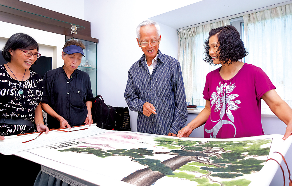 說到此時,在場的另外兩位徒弟黃秀英及蔡媛珠亦一同和應,透過陳老師,她們亦認識近十年,各人更以「師姐、師妹」相稱。恰巧地,兩人早年同為車衣女工,憑着一雙巧手,繪畫國畫更是得心應手,秀英看着早前經陳老師指導下畫出的「松鶴圖」,筆風細膩有致,對於自己能畫此妙筆丹青的國畫亦大感驚訝。另外,媛珠則自豪地說:「學了國畫,我除了得到很多樂趣,還學識鑒賞,多了不少藝術氣質。」