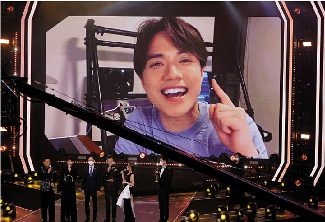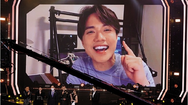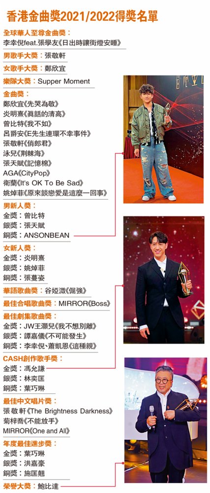 (大公報記者 溫穎芝、徐小惠<文>、林良堅<圖>)「香港金曲頒獎典禮2021/2022」昨晚在電視廣播城舉行,這是由電視廣播有限公司(TVB)與香港電台首度合辦的樂壇頒獎禮,共頒發13組合共35個獎項,張敬軒成為昨晚大贏家,分別拿下男歌手大獎、最佳中文唱片男歌手獎、香港金曲獎三個獎,惟因身邊工作人員確診新冠肺炎而被列為緊密接觸者,導致無法到場;唱片公司方面,TVB music group Ltd拿到八個獎,為全場最多。