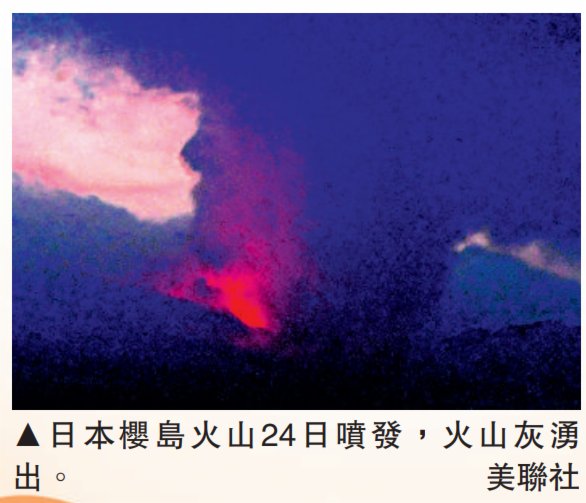 櫻島火山於當地時間周日晚上8時05分噴發,當地氣象廳指火山灰升至距離火山口300米高空,並有火山岩石飛至2.5公里外的區域。周日噴發現場影片顯示,紅色岩漿從火山一側流下,火山口有紅色噴射物以及濃煙冒出。