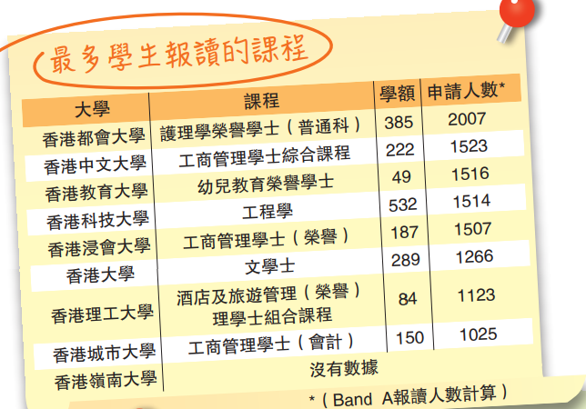 目前全球都出現醫護荒,今次改選最受歡迎課程,是香港都會大學資助計劃課程(SSSDP課程)的護理學榮譽學士(普通科),有多達2007名BAND A生報讀,與去年相若。第二名是中大的工商管理學士綜合課程,共1523位BAND A生報讀。第三名是教大的幼兒教育榮譽學士,共有1516人報讀。