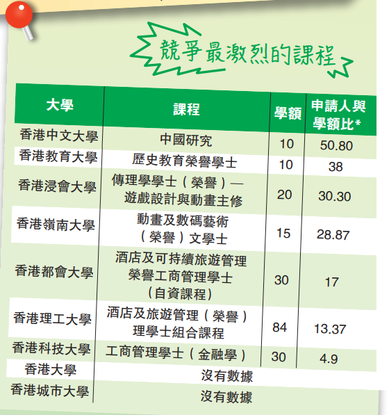 至於各院校最多人報讀和最多人競爭的分別是,港大最多人報的科目是文學士;科大最多人競爭的科目是工商管理學士(金融學),最多人報讀工程學;中大最多人爭中國研究,最多人報讀工商管理學士綜合課程;嶺大最多人爭動畫及數碼藝術(榮譽)文學士。而教大最多人爭歷史教育榮譽學士(只有10個學額),最多人報讀幼兒教育榮譽學士;浸大最多人爭傳理學學士(榮譽)─ 遊戲設計與動畫主修,最多人報讀工商管理學士(榮譽);都大的SSSDP課程最多人爭「運動及康樂管理榮譽學士」,最多人報讀護理學榮譽學士(普通科);而理大最多人爭及最多人報讀酒店及旅遊管理(榮譽)理學士組合課程;城大最多人報讀工商管理學士(會計)。
