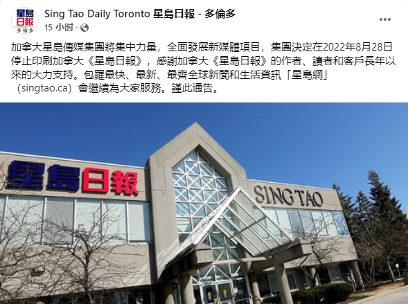 加拿大《星島日報》自1978年創刊。去年4月,該集團曾宣布裁減34名員工,以減低疫情對集團影響。