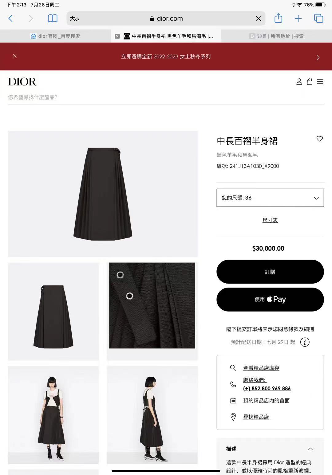 而記者在瀏覽迪奧官網時卻發現了其中的「貓膩」。雖然迪奧在官方網站下架了「半裙」分類下的爭議商品鏈接,但是消費者可以通過「秋冬新品分類」找到這款「馬面裙」商品,商品介紹中依舊寫着「這款半裙採用標誌性的的迪奧廓形」。售賣方面,迪奧中國大陸、美國、加拿大、巴西等少數幾個國家的官網頁面顯示該產品已售罄,然而香港、台灣、新加坡、日本、韓國等國家和地區均顯示有貨並可購買,多家台灣迪奧女裝店更是可以預留貨品進行線下預約會面。