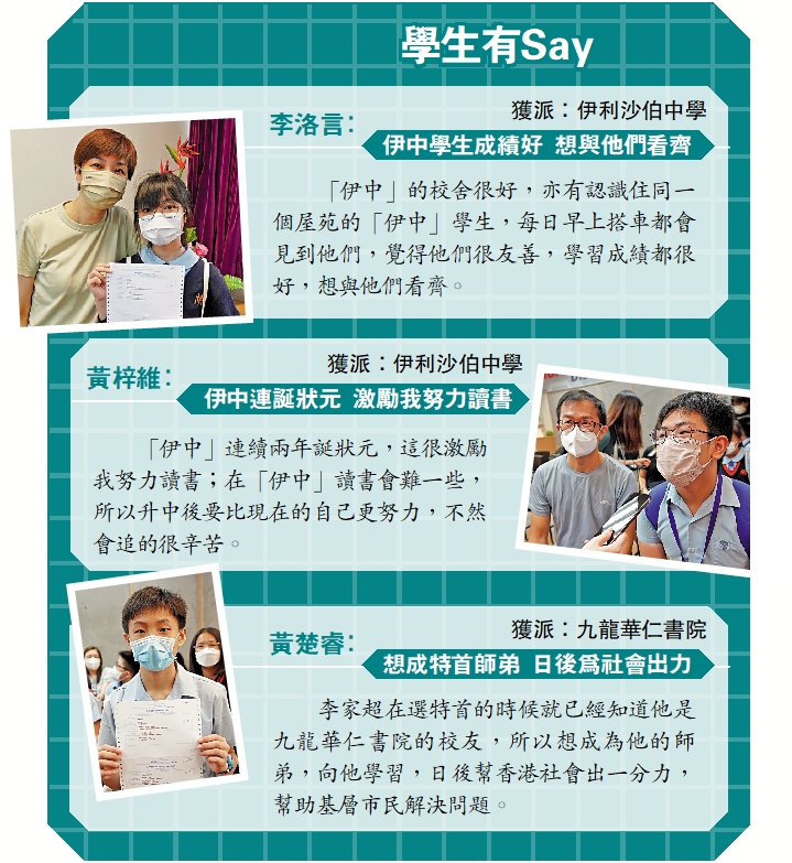 此外,獲派第一志願九龍華仁書院的黃楚睿說,除了良好的學習環境外,「九華」的課外活動及運動設施都十分吸引,故他希望日後到學校能參加游泳隊,在認真學習的同時亦加強體育訓練。同時他又說,在今年統一派位選校的時候,李家超已宣布參選行政長官,當時他有聽聞時任特首候選人的李家超為「九華」校友,故萌生想想成為他師弟的念頭,「想向他學習、看齊,以後能幫香港社會出一分力,幫助基層市民解決問題。」