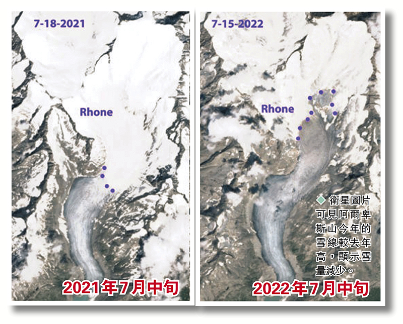 香港文匯報綜合報道,在氣候變化近年持續加劇下,歐洲阿爾卑斯山的冰雪融化速度顯著加快,今年歐洲更遭受熱浪來襲,不但冰川融化更急速,錄得冰點(即攝氏零度)的山脈高度更升至5,184米,是歷來最高,甚至高於西歐第一高峰勃朗峰,意味一些生活於高山嚴寒地帶的野生物種,可能將無處棲身。