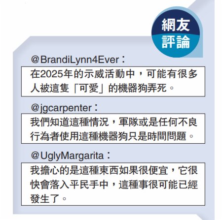 評論指,機器狗在美國可以靠網購獲得,若有不法分子受此啟發,將之改造成殺人武器,或將造成嚴重後果。波士頓動力公司表示,不會把自己的機器狗出售給那些打算把它們用作武器的人。但這並不能阻止別人將機器狗改裝成「殺手」,也無法代表其他生產機器狗的廠商想法。