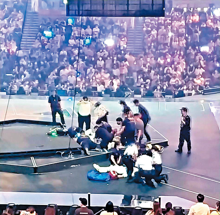 (香港文匯報 記者 蕭景源)香港男子組合MIRROR昨晚在紅館舉行的第四場演唱會發生嚴重事故。約晚上10點半,當成員盧瀚霆及呂爵安合唱《Elevator》與大批舞蹈員走到小舞台時,台中央吊在半空的巨型電子屏幕突然斷纜墜下,砸中兩名男舞蹈員,其中一人直接被砸中頭部重傷,現場歌迷一片恐慌。消防員到場救出傷者,並送往伊利沙白醫院救治,另一名女歌迷受驚送院,而演唱會宣布腰斬。