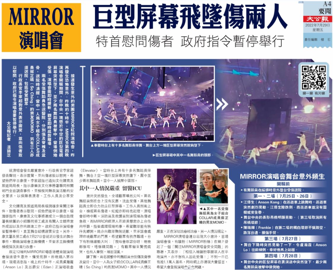 原定12場的MIRROR紅磡香港體育館演唱會接連發生意外,備受批評。昨晚踏入第四場,現場消息指,晚上約十時半,成員盧瀚霆(Anson Lo)及呂爵安(Edan)正演唱歌曲《Elevator》,當時台上共有十多名舞蹈員伴舞,舞台上空一塊巨型屏幕突然墮下,壓中至少兩名舞蹈員。當中一人被壓中頭部。