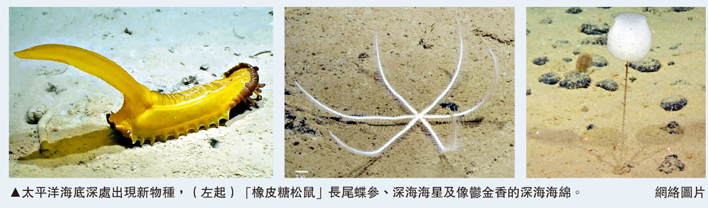 英國研究人員18日在Zookeys雜誌上發表的報告指出,在太平洋深海超過4800米深的地方發現36個生物標本,在4125米的海山斜坡上發現2個標本,在3095米至3562米深的位置發現了17個標本。在5040米深的海床,研究人員發現一種外形酷似「橡皮糖松鼠」、長約60厘米的長尾蝶參;還有一種深海海綿外形像一株白色的鬱金香。