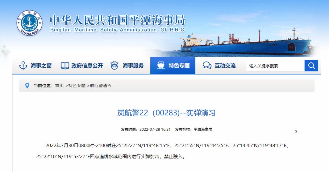7月28日,平潭海事局發布航行警告,O7月30日8時至21時 ,福建平潭一岐嶼附近水域執行實彈射擊訓練任務,禁止一切船舶進入。