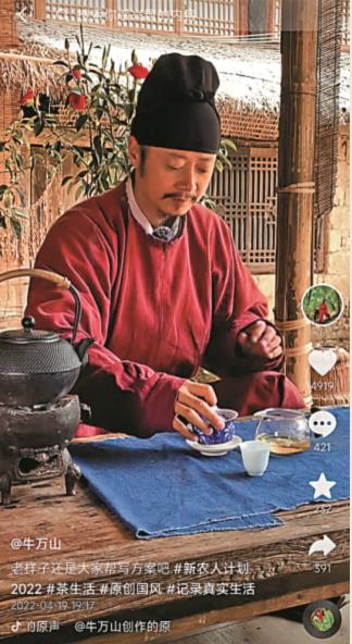 記者在抖音看到,「牛萬山」深居雲南臨滄山間,他總是會在古樂聲中身着唐裝,時而爬山遠遊,時而在家煮茶看書,舉手投足古韻盎然。「你看他時常會突發一念,馬上起身或去溪邊燒水飲茶,或去田間撅一把青菜,燒一頓美味。」夏梓柏明白,自己的真實生活在城市,因此「每天刷刷視頻,跟着牛哥一起『隱居』,將自己的生活調理順暢,那也是一種滿足。」