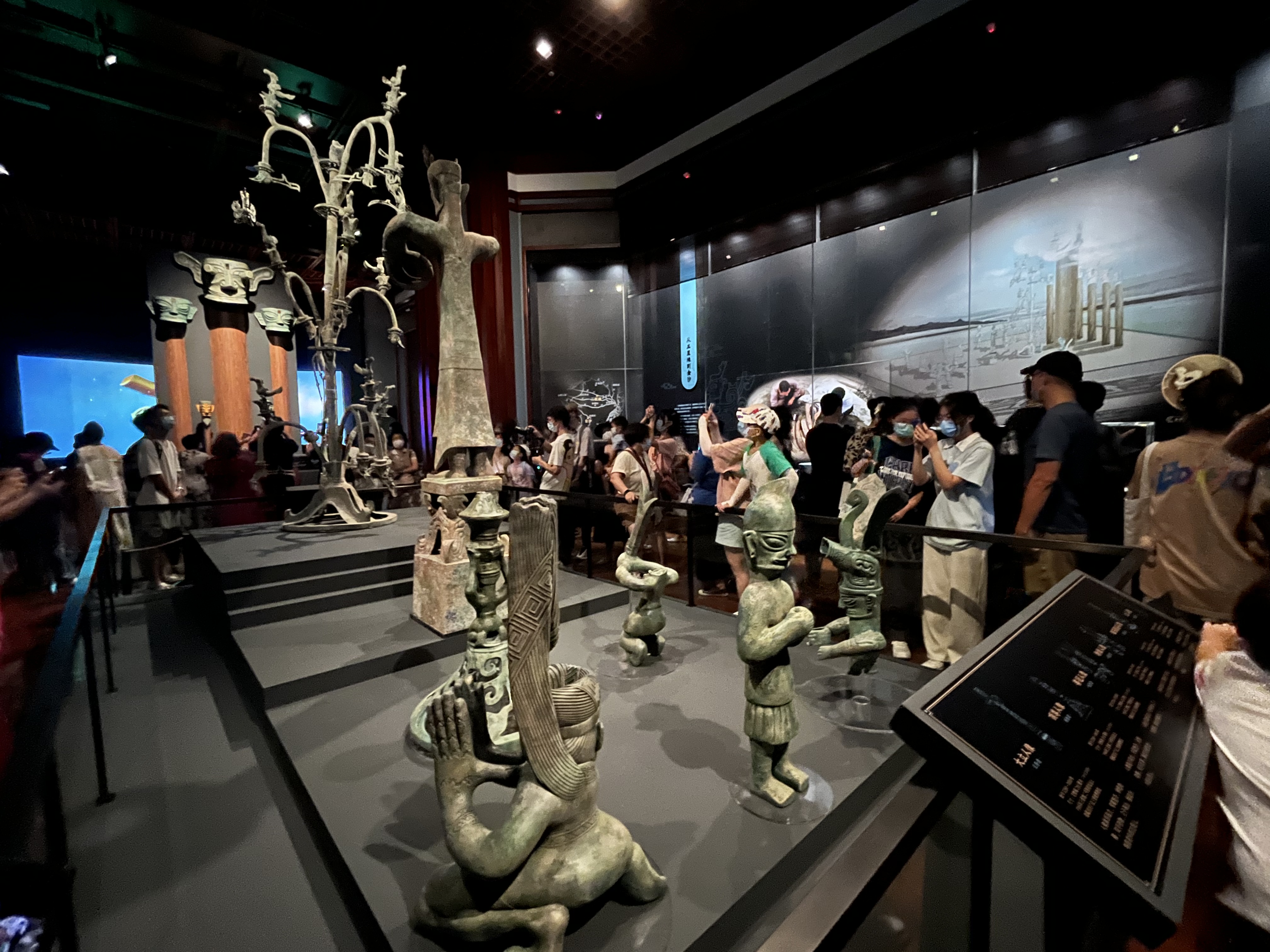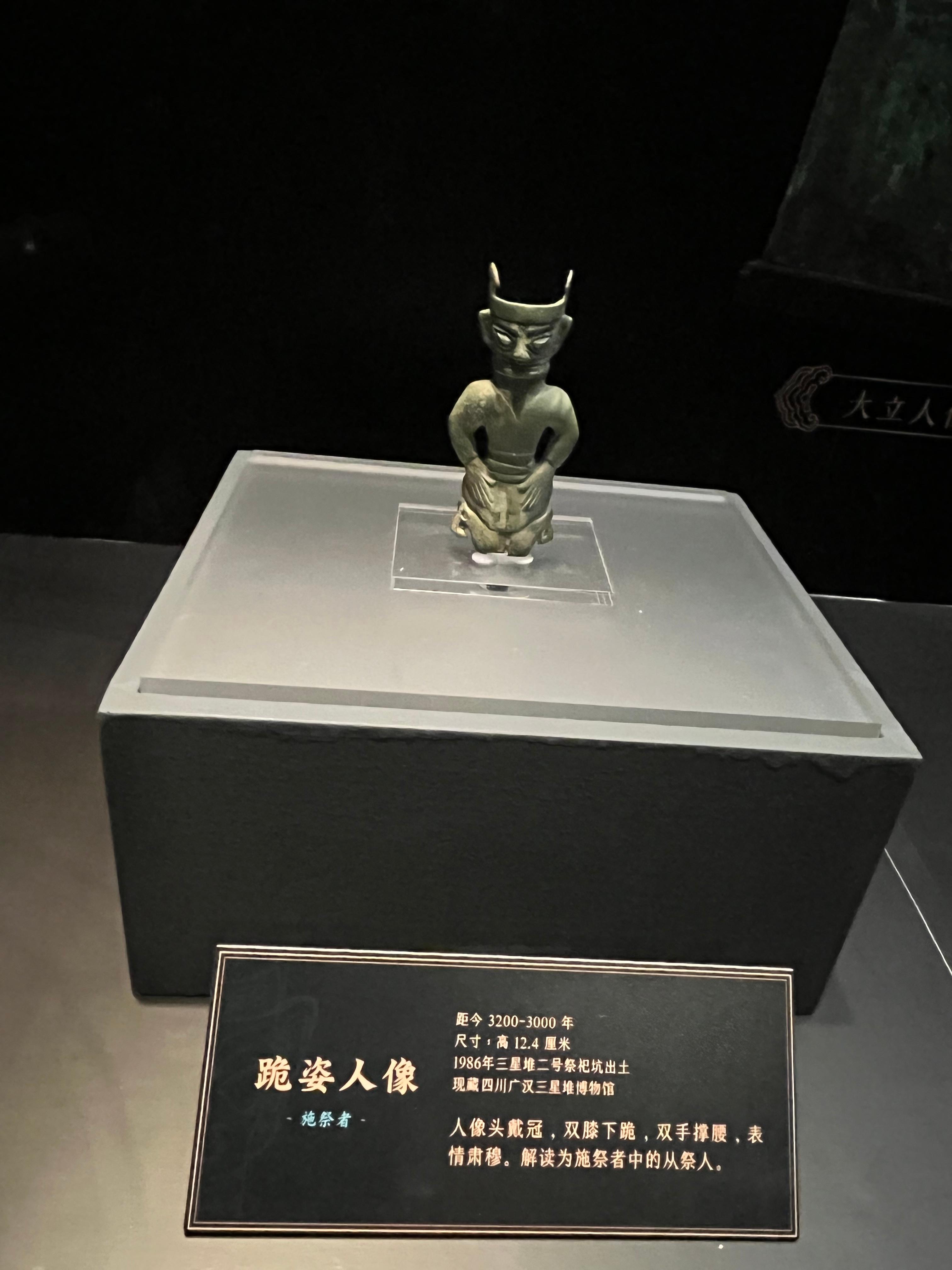 展覽突出「小而精」,以聚焦模擬重現的三星堆祭祀場景為核心,分為施祭者、建木通天、受祭者三個單元,共展出來自四川廣漢三星堆博物館和成都金沙遺址博物館的文物15件(套),其中一級文物14件(套)。