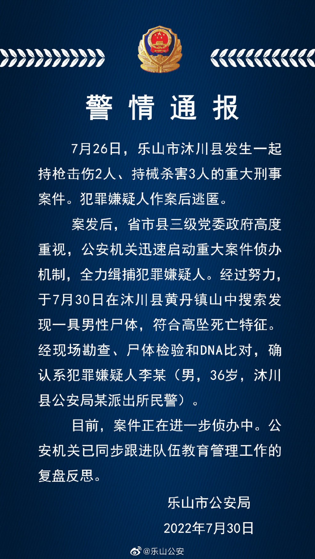 案發後,公安機關迅速啟動重大案件偵辦機制,全力緝捕犯罪嫌疑人。經過努力,於7月30日在沐川縣黃丹鎮山中搜索發現一具男性屍體,符合高墜死亡特徵。經現場勘查、屍體檢驗和DNA比對,確認系犯罪嫌疑人李某(男,36歲,沐川縣公安局某派出所民警)。